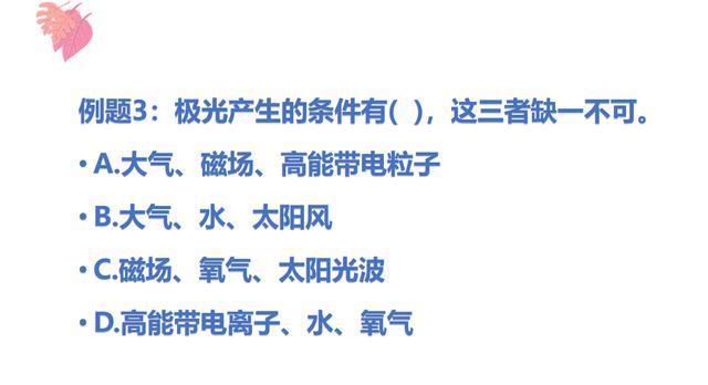 答案解析:地球的极光,来自地球磁层和太阳的高能带电粒子流(太阳风)使高层大气分子或原子激发(或电离)而产生。极光产生的条件有三个:大气、磁场、高能带电粒子。