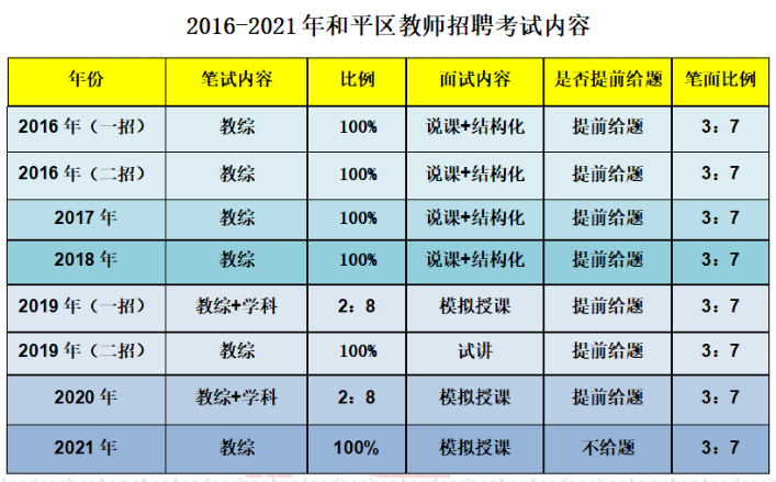 笔试内容:一招考学科,二招考教综。从下图历年笔面内容中也可以看到,北辰区历年笔试内容不是很稳定,还是那句话,考天津教师,教综+学科都需要认真学习。