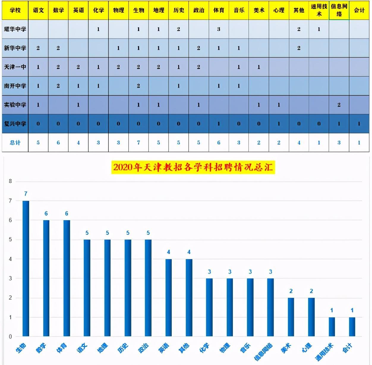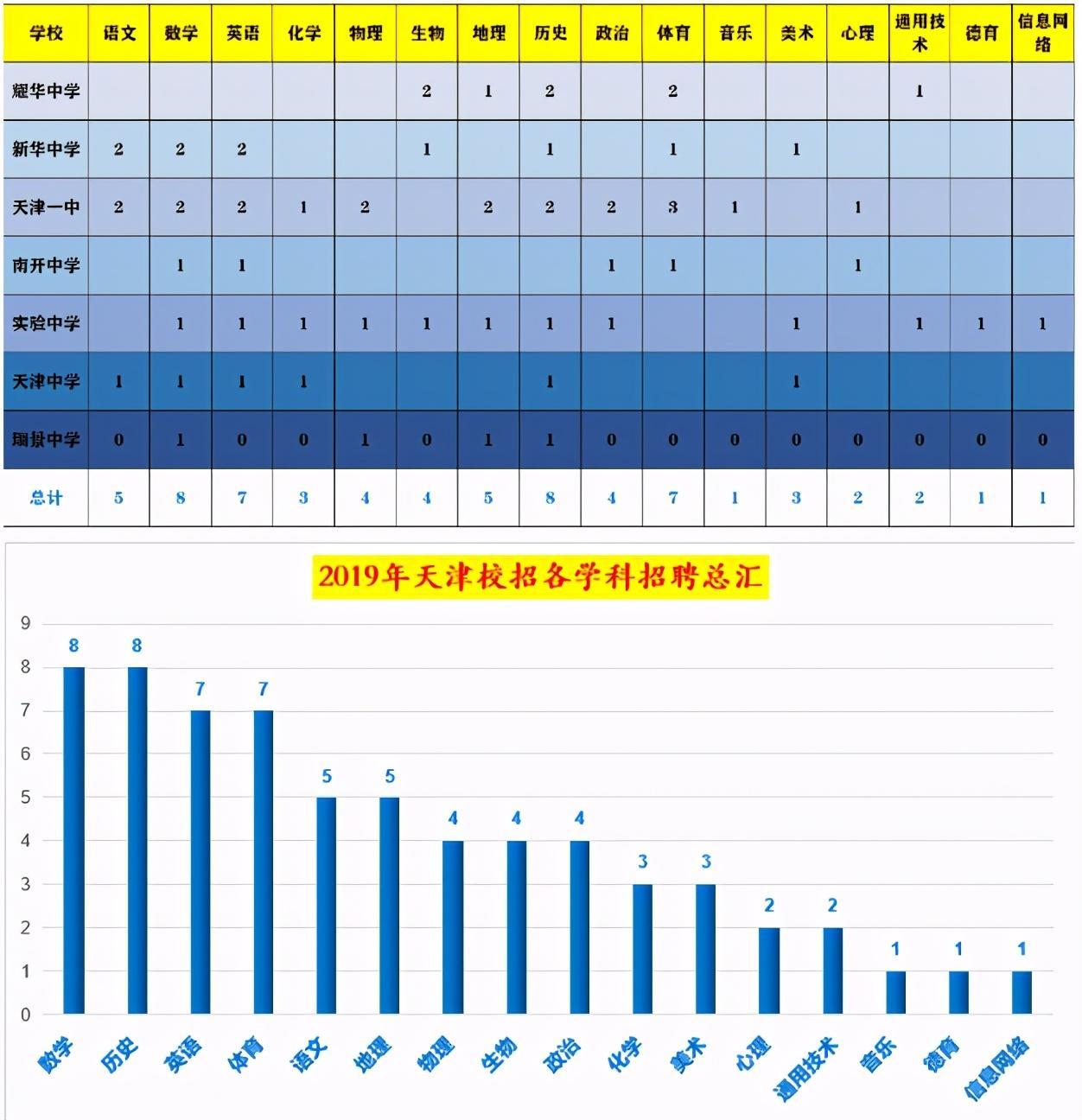 校招的学科招聘数量远不能和区招相比,毕竟是单独的学校,所以,有可能你各项招考条件都符合,也无对应学科可选,老师总结了近三年天津校招各学科招聘数量,供同学们参考。