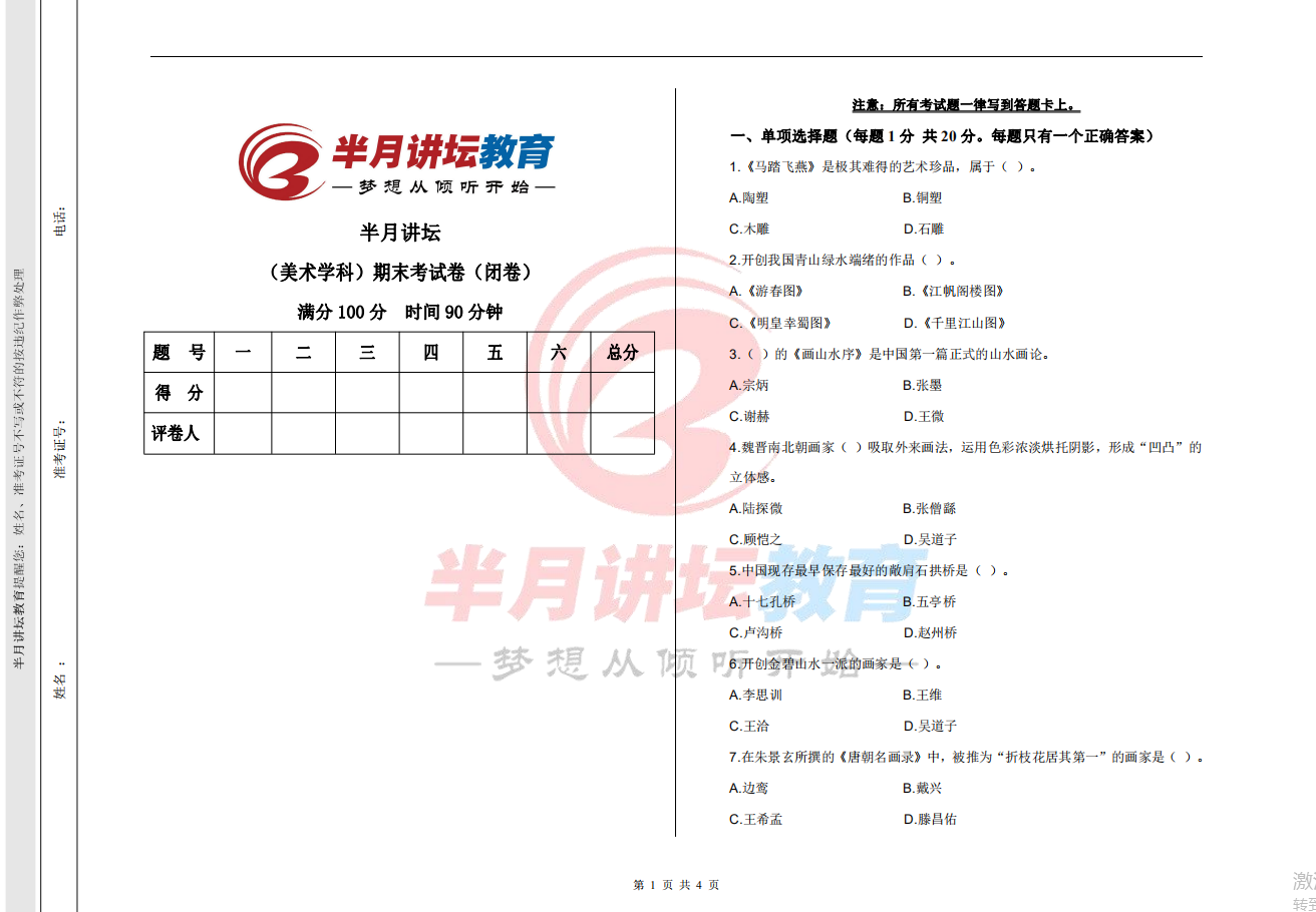 首先,我们来看一下美术试卷的占比情况,以100分的美术试卷为例:
