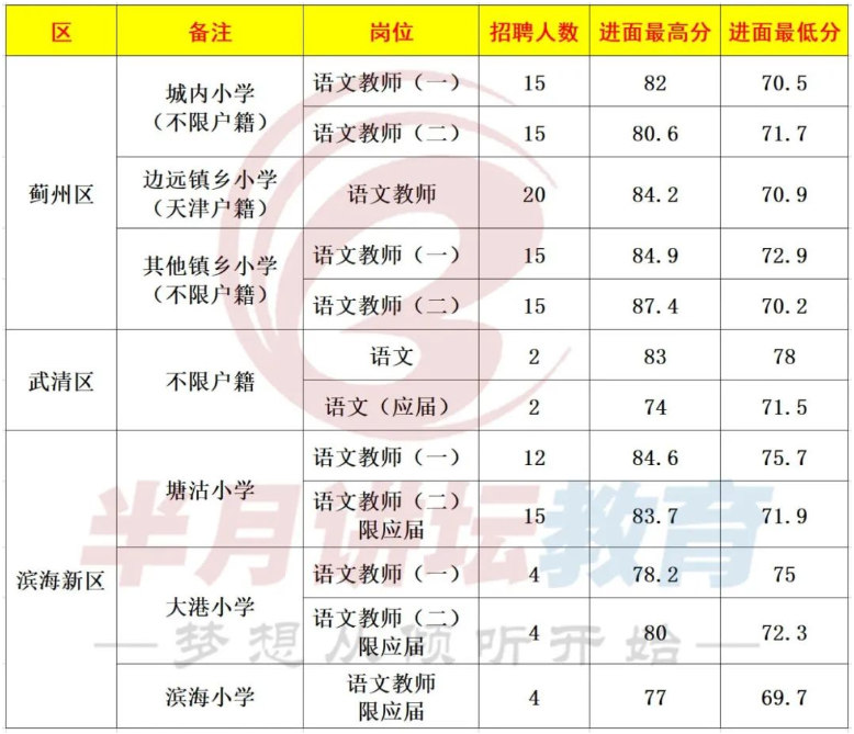 2022年教招,武清区只考学科,蓟州和滨海:教综+学科。最高分在蓟州区,其他镇乡小学语文教师(二)最高进面分87.4;最低分在滨海新区:滨海小学(限应届报考)最低进面分69.7。