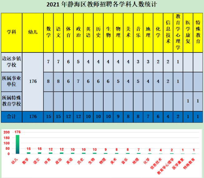 2023年静海区教师招聘与之前情况不太一样,除了特殊教育和医学岗以外,全部不限专业,并且幼儿岗位和中小学岗位分开进行招聘,幼儿招聘176人在中天人力进行,中小学招聘130人在北方人才进行,总招聘人数达306人。