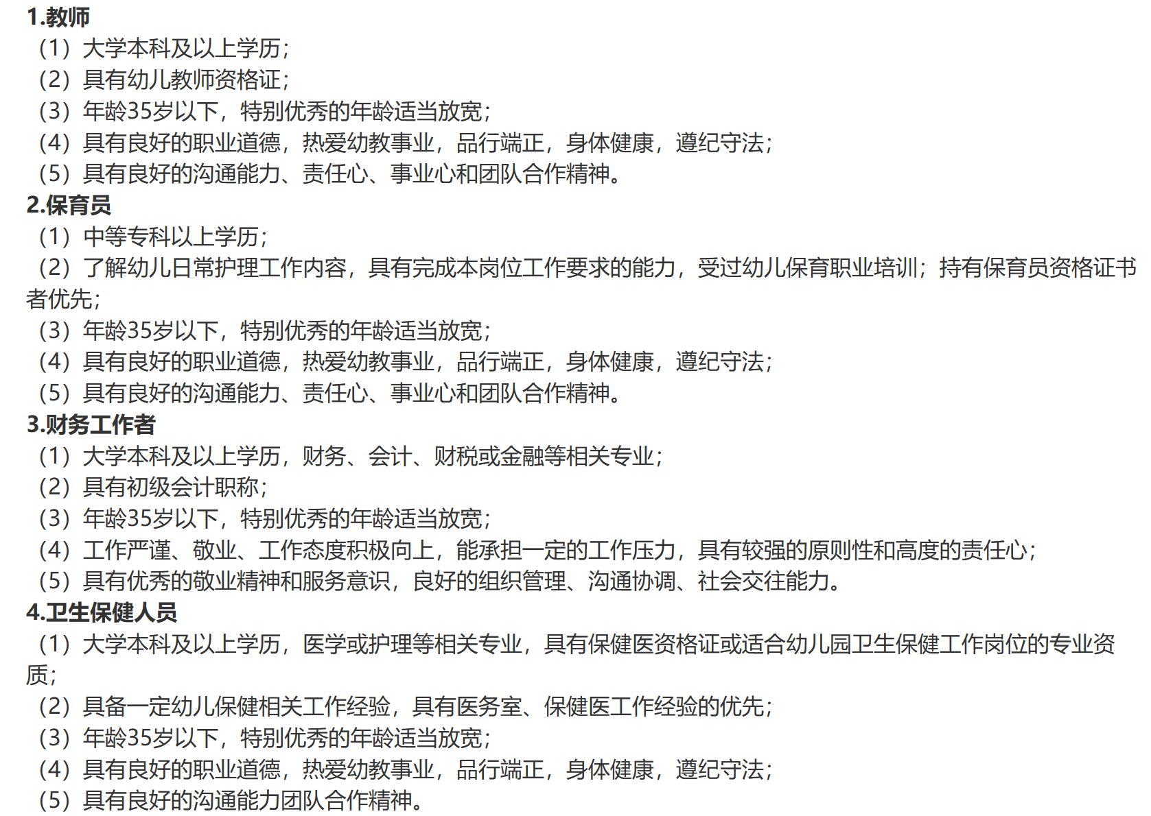本次共招聘公办幼儿园教职工39人,其中教师11人,保育员5人,财务工作者1人,卫生保健人员3人,食堂管理员2人,主厨3人,其他人员14人。