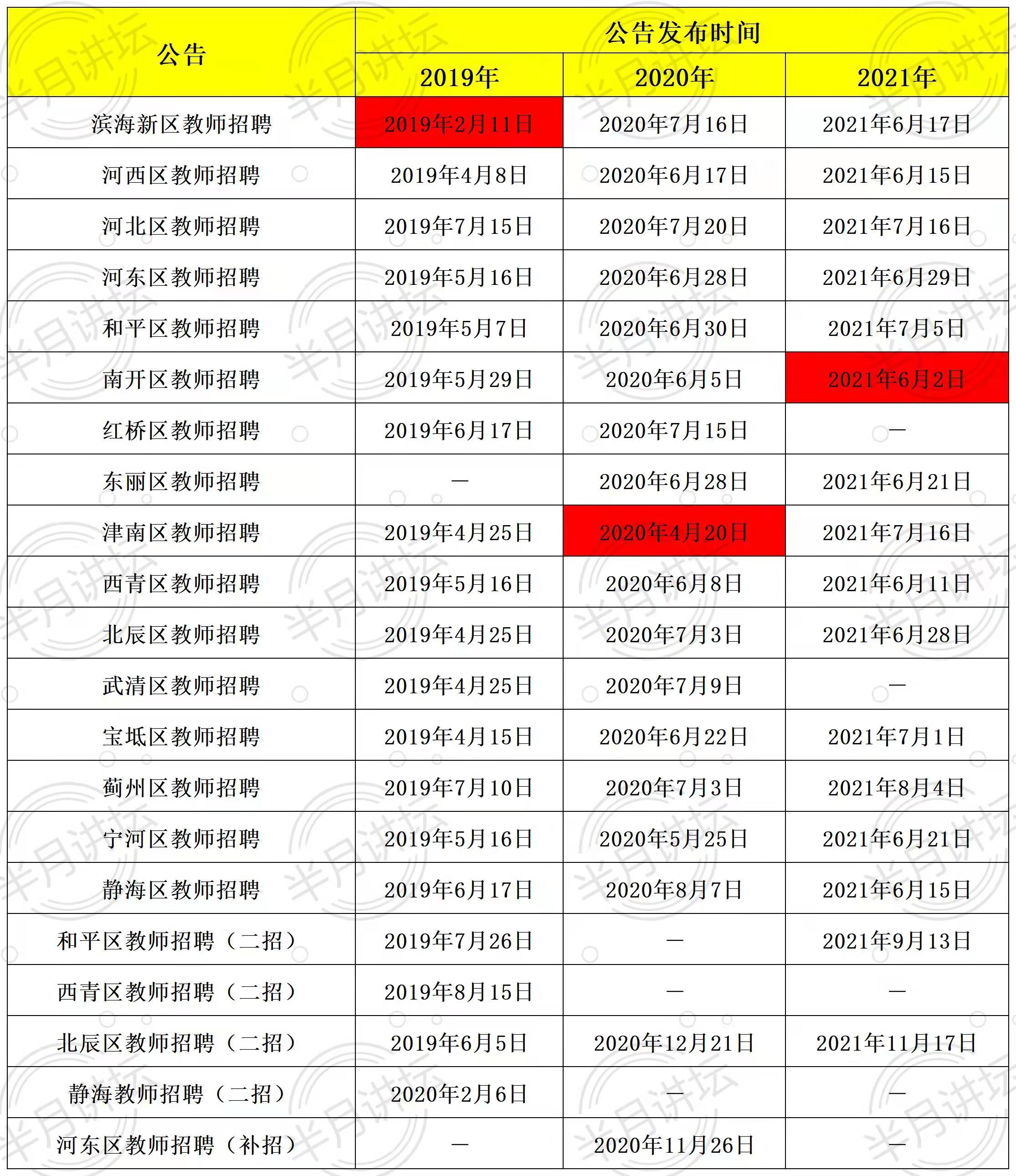 专注天津教师招聘考情,咨询比较多的还是2022年天津市教师招聘公告什么时候发布,咱们先来看看近三年来天津市各区教师招聘公告发布的时间。