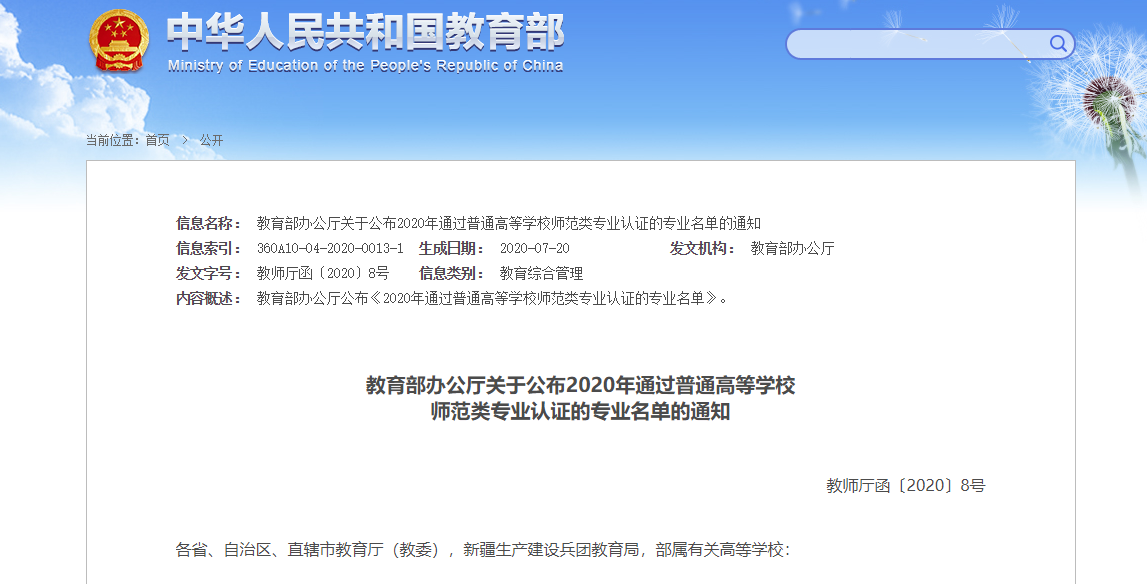 教育部办公厅已公布2023年通过普通高等学校师范类专业认证的专业名单的通知。