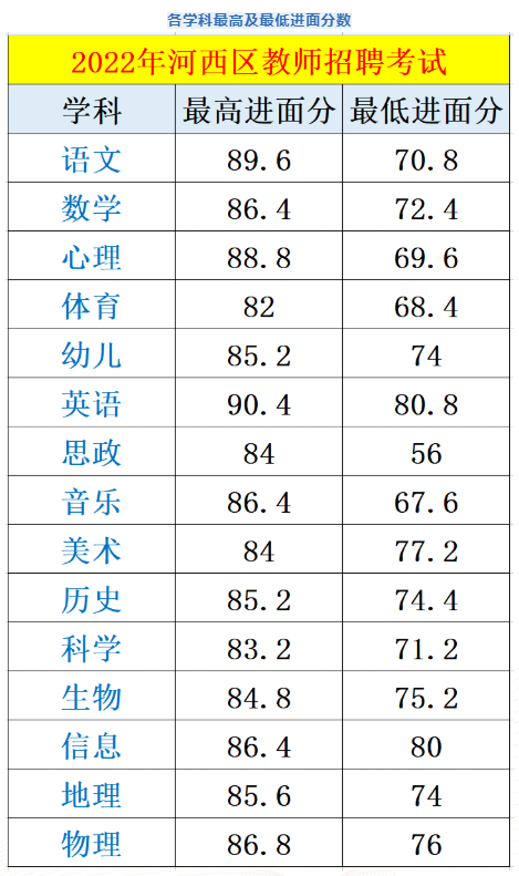 河西区笔试单考教综,大部分岗位的进面分数还是集中在80左右,我统计了最高和最低的,仅供参考。