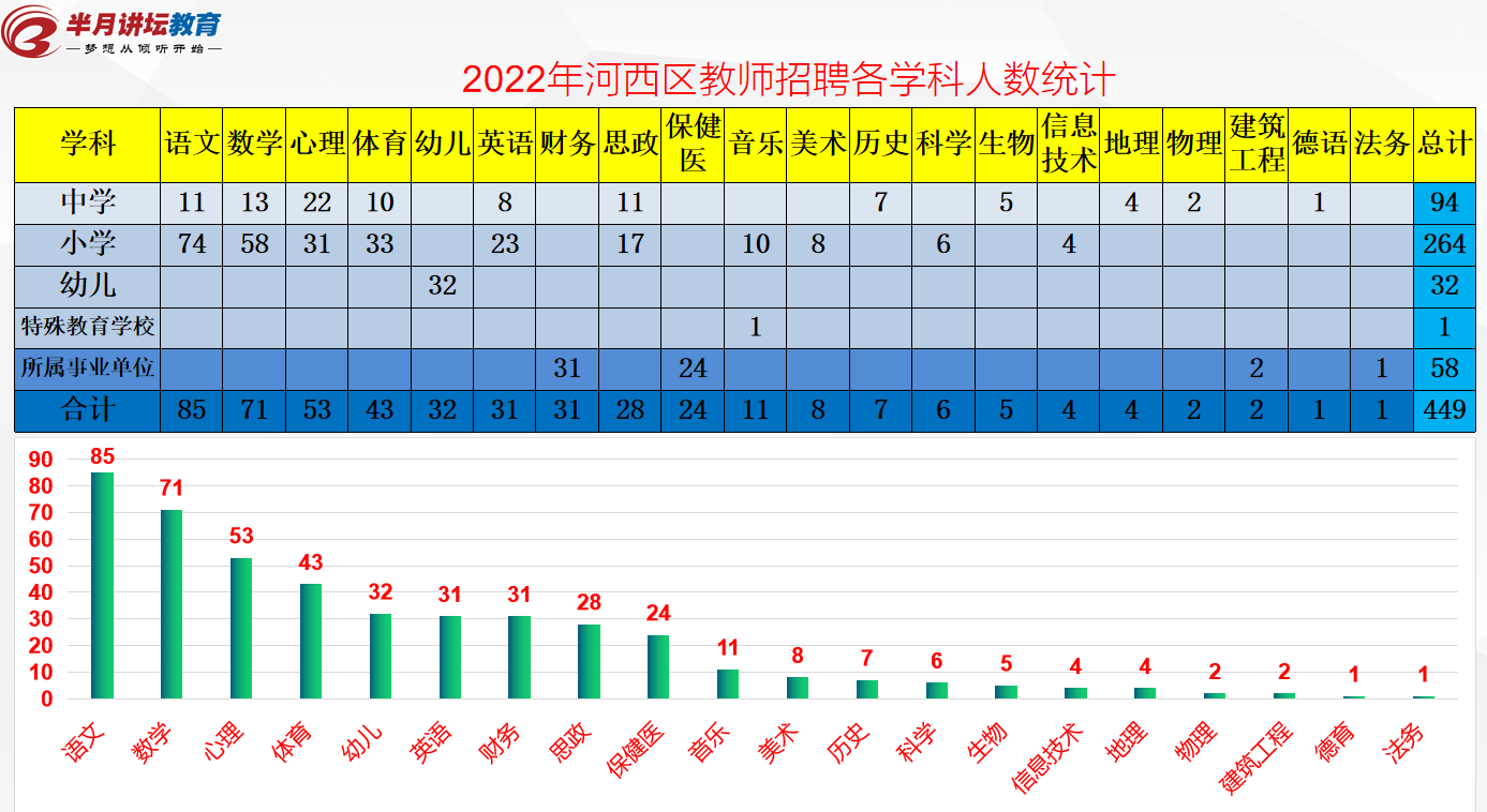 招聘人数较多的学科有:语文、数学、心理,体育学科在排在前列;河西区是少有的幼儿学科人数没有进前三的。语文学科招聘人数比较多,中学招聘11人、小学招聘74人,共计85人,今年语文学科的招聘人数河西给撑起来不少!