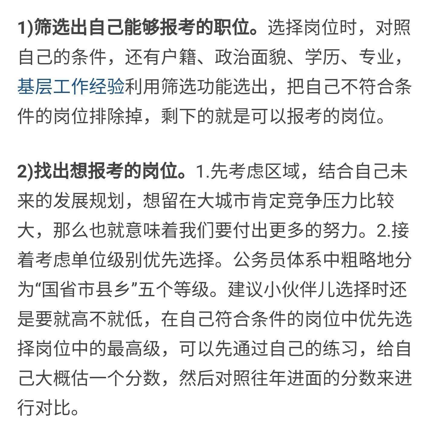 大专学历本身在学历上就不占优势,所以可以在选岗上多下功夫,优先选择专业对口的岗位,往往报名人数相对比较少,上岸机会大。有的小伙伴可能因为专业冷门就认为自己只能三不限的岗位,但事实上并非如此。具体可以上网查询下自己所属的专业大类和相关专业,遇到合适的岗位,果断报考。比如药学专业可以考虑环保部门、市场监督部门、检验部门等。汉语言文学专业可以报考文秘岗位等,化学专业可以报考专业技术岗等。关于选岗建议看这里~