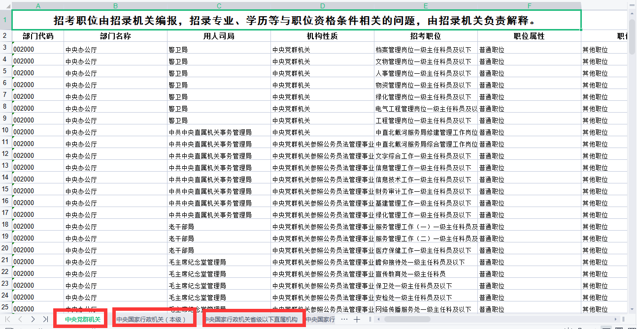 ②底部有“中央党群机关”、“中央行政机关(本级)”等多个工作表,每个工作表都多去看一看。