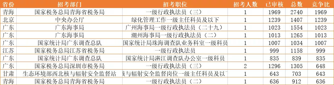 2、专业不限问题。比如2023年国家公务员考试报名人数最多的岗位为青海国家税务总局青海省税务局一级行政执法员(三),此岗位仅招录1人,目前已经有1969个人过审,报名人数高达2740人,竞争比达1969:1。报名第四日此岗位已经稳定竞争比第一,后面几天依然有上升趋势。