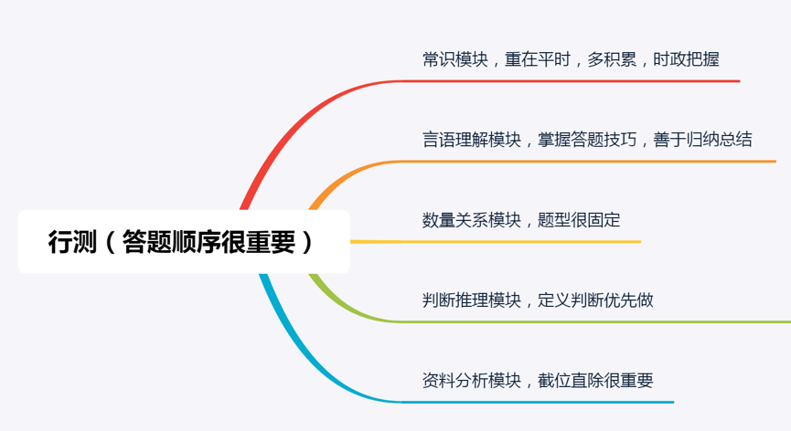 行测的复习,没有什么捷径,掌握解题技巧,然后通过大量练习,提高解题速度与正确率才是拿高分的关键,合理安排好答题顺序,先选择自己最擅长的那一部分来做,把能做的做对,才是提分的关键。