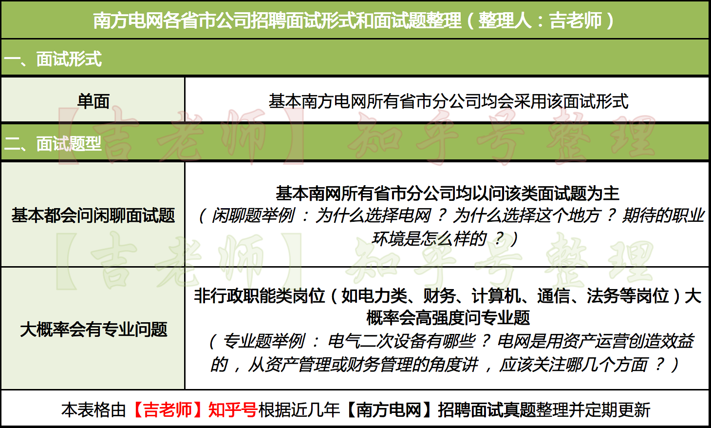 上表是吉老师根据考友回忆的近几年面试形式面试真题整理的各南方电网招聘面试情况复盘表。虽然每一年的面试形式面试题可能有调整的空间,但是吉老师建议在进行南网面试准备时,按以下思路进行准备: