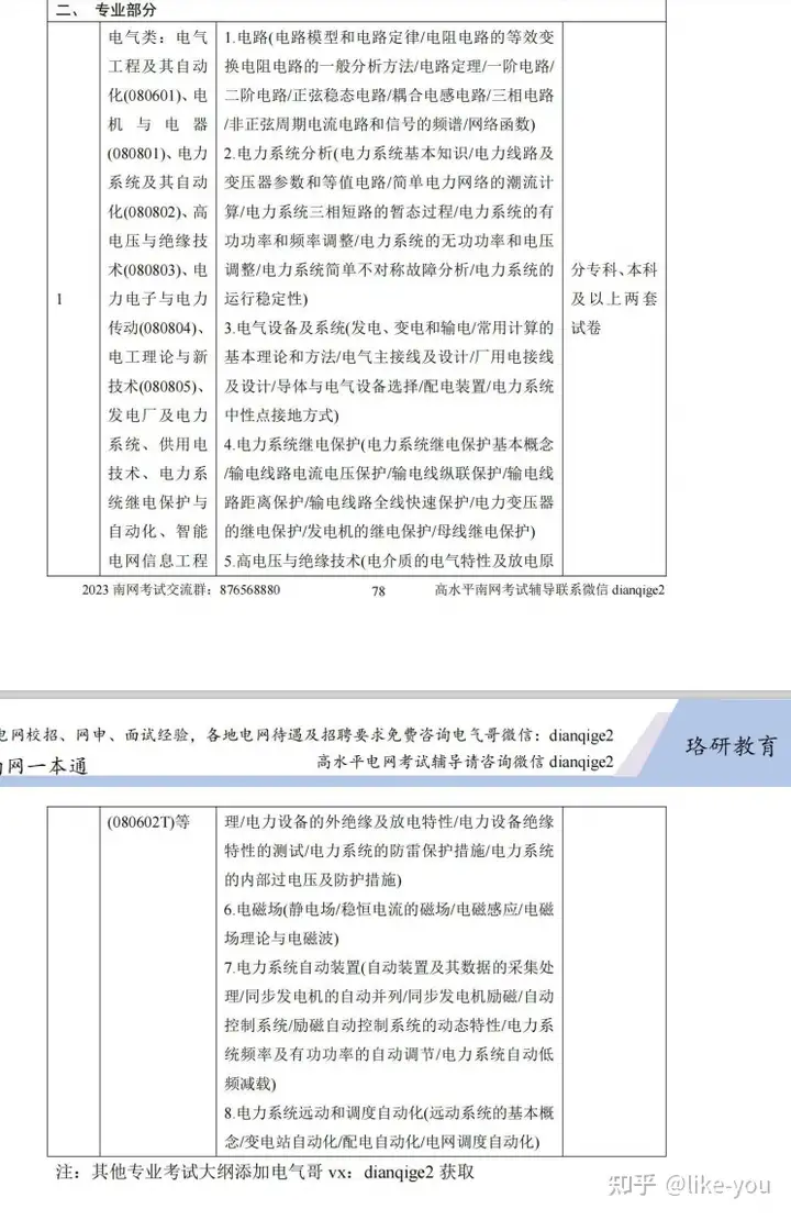 然后是备考。备考方面,今年的考情大概是这样的,今年是第一次南网五省统考,统考的出现意味着以后人事方面上面将会插手越来越多,2021年招聘分配也已经体现出部分端倪了。另外招聘的正规化也意味着南网的笔试比重将会慢慢提高,原来的三七比已经在今年变成五五比了,如果最终向国网靠拢的话,将会变成七三比,主观性较大的面试降低比重将对大部分普通学生越来越友好,但是也意味着笔试复习的时间将要加长。其次是根据南网大纲进行笔试复习,笔试非专业题占比3成,主要涉及行测以及时事、企业文化,专业课部分电气类大纲如下