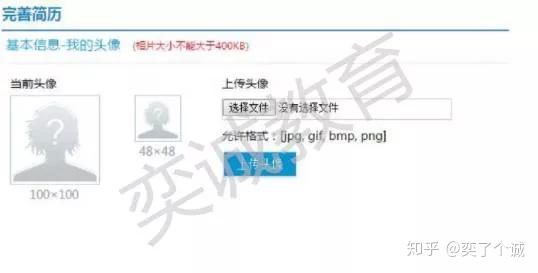 提交基本信息后跳转到以下页面,上传头像。上传图片不超过不400KB,允许格式如图所示。