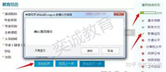 注:尽可能多的填写内容,简历完成状态越好,招聘公司所看到的内容也就越多,资格审查也越容易通过。另外如有需要还可以添加教育经历,如双学士学位的情况。