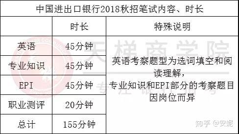 中国进出口银行在2018秋招改革之前,笔试形式为纸考,考查学科是英语、综合知识和申论。2018秋招改革之后,中国进出口银行考试采取机考的形式,笔试内容也发生了较大的变化,具体内容包括英语、专业知识、EPI、职业测评四部分,和六大行的笔试内容有些相似。