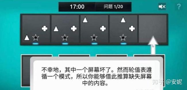 你今天的工作是创建员工轮值表。不幸地,其中一个屏幕坏了。然而轮值表遵循-个模式,所以你能够借此,推算缺失的屏幕中的内容。正确识别序列中的下一个图案。