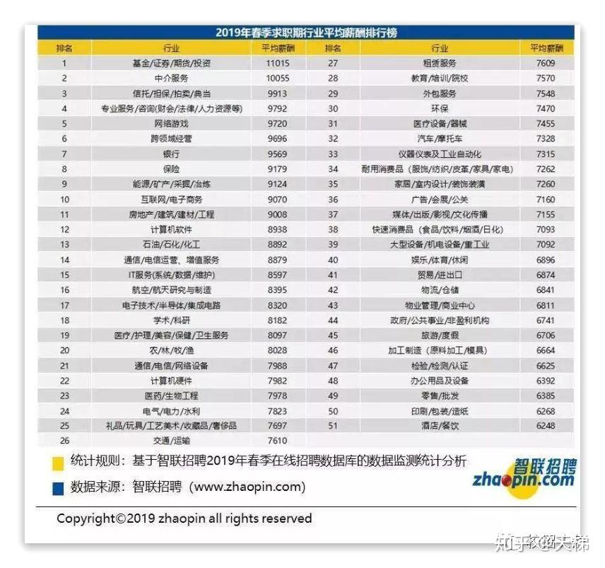 根据智联招聘权威数据报告统计,2019年春季求职行业平均薪酬排行榜显示,银行以均薪9569元排名第七。从图中可知,在排名前十的高薪行业中,银行招聘条件相对宽松,接受二、三本院校学生,通过率相对较高。