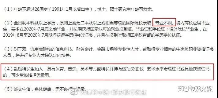 招商银行大部分岗位专业不限,其他银行也有类似情况~不光如此,现如今部分银行还鼓励特长生加入,原本以为特长生只能依靠自己的特长就业,现在银行对你们敞开大门~体育生、音乐生、美术生进银行不是梦~