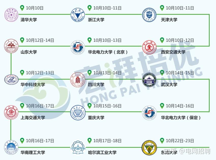 参考往年,江苏电网接下面会公布高校宣讲行程表,主要先针对14所进行招聘。所谓14所,即清华大学、上海交通大学、浙江大学、重庆大学、四川大学、华北电力大学、天津大学、华中科技大学、哈尔滨工业大学、西安交通大学、华南理工大学、山东大学、武汉大学及东南大学。14所的行程安排一般是从10月初至10月中下旬,去年行程安排参考:
