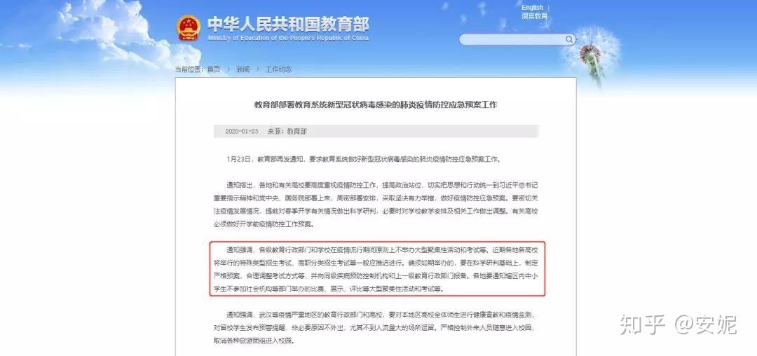 1月24日,教育部下发《教育部部署教育系统新型冠状病毒感染的肺炎疫情防控应急预案工作》,明确指出近期各地各高校将举行的特殊类型招生考试、高职分类招生考试等应推迟进行。