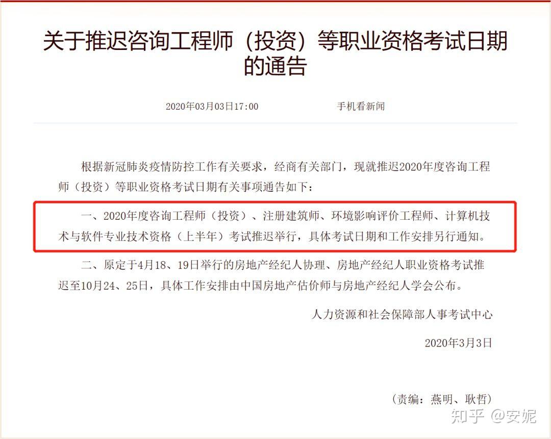 咨询工程师(投资)、注册建筑师、环境影响评价工程师、计算机技术与软件专业技术资格(上半年)考试推迟举行,具体考试日期和工作安排另行通知。