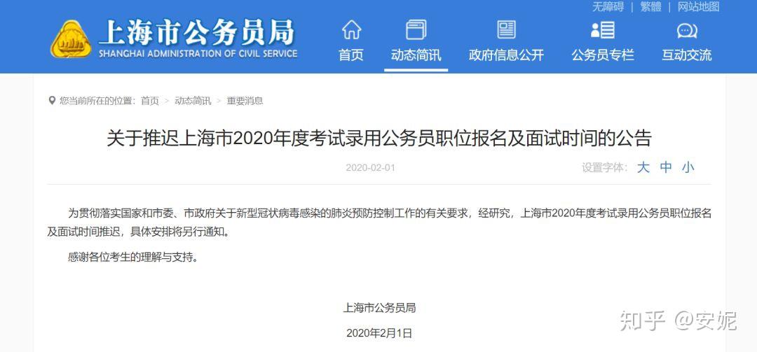 上海市公务员局发布了《关于推迟上海市2020年度考试录用公务员职位报名及面试时间的公告》,宣布为贯彻落实国家和市委、市政府关于新型冠状病毒感染的肺炎预防控制工作的有关要求,本市2020年度考试录用公务员职位报名及面试时间推迟,具体安排将另行通知。