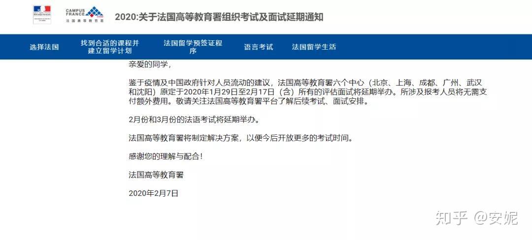 鉴于疫情及中国政府针对人员流动的建议,法国高等教育署六个中心(北京、上海、成都、广州、武汉和沈阳)原定于2020年1月29日至2月17日(含)所有的评估面试将延期举办。所涉及报考人员无需支付额外费用。2月份和3月份的法语考试将延期举办。