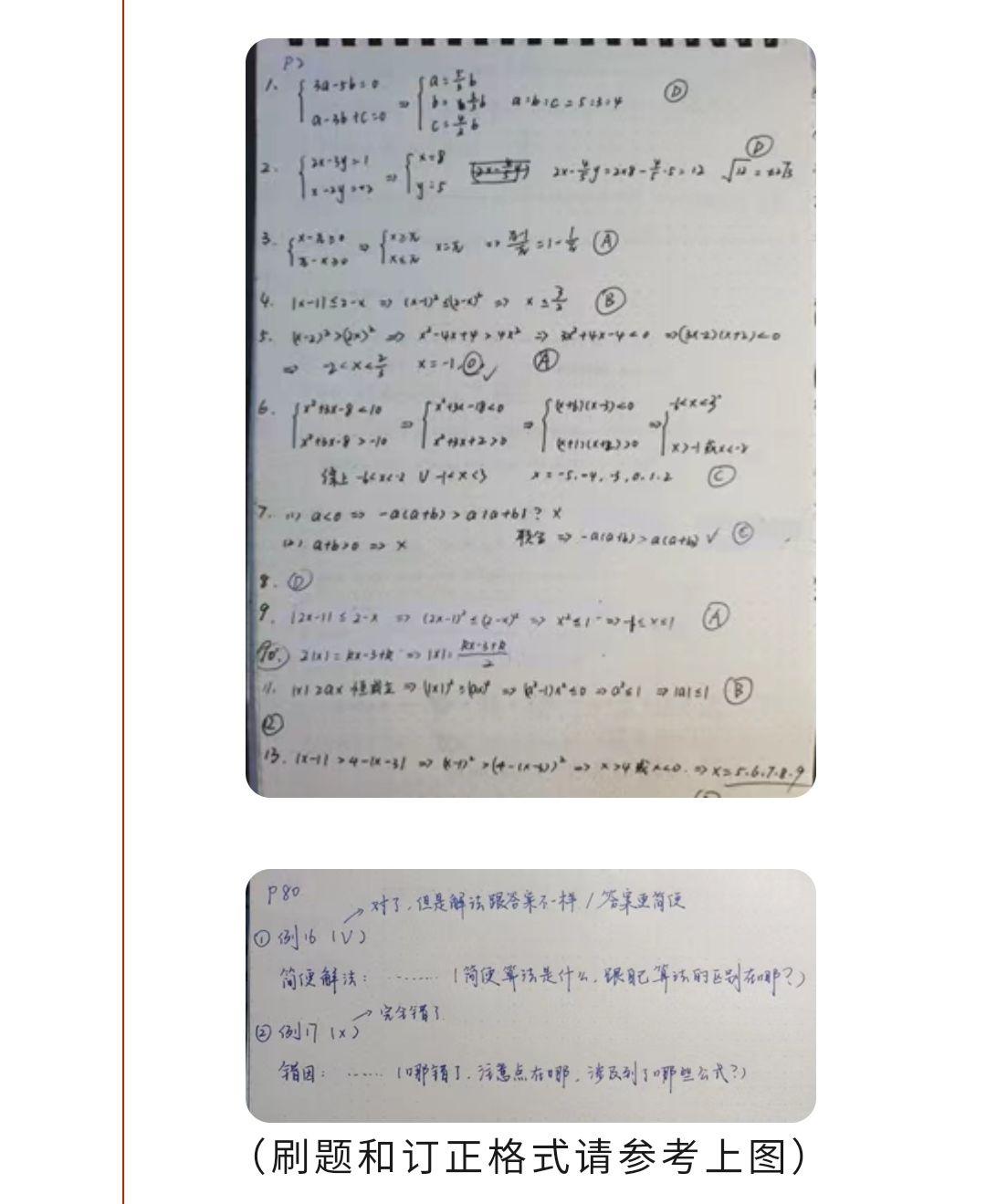 重点:刷题及订正错题讲究的是效率,大家可以准备两本本子:一本用于刷题,一本用于订正错题。刷题时,大家可以把步骤写在上面,方便后面对答案时找出错处。订正时,不要抄题,很费时间,直接订正步骤即可。