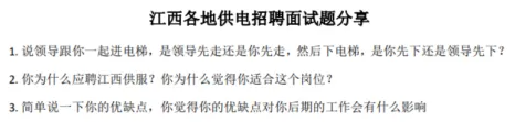 江西各地供电招聘面试是以半结构化形式为主,主要考察应聘者身心素质、团队协作意识、组织沟通能力等综合能力,以及就业意向等。