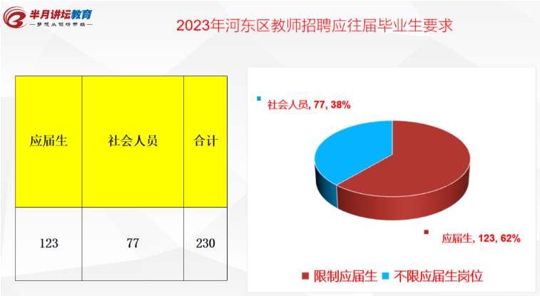 面向应届生招聘的岗位123人,占招聘人数的62%,不限制应届生的岗位77人,占总招聘人数的38%,河东区往届生岗位相对来说没那么多。