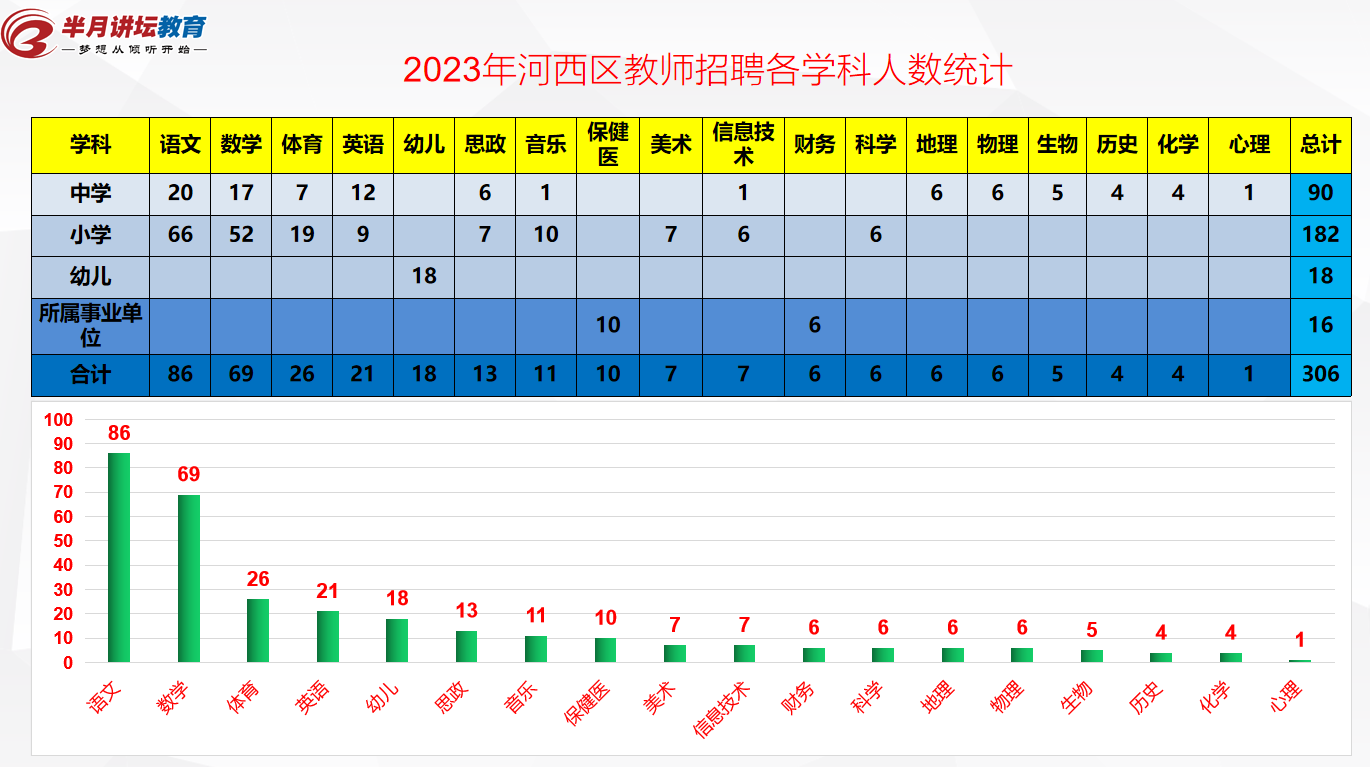 最近这几个公告招聘幼儿学科都不是很多,河西区去年招聘心理教师也挺多,今年只招聘了1人,心理学科教师比例补满后,也不会再有大量招聘了。