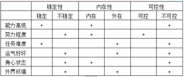 韦纳把归因分为三个维度:内部归因和外部归因,稳定性归因和非稳定性归因,可控制归因和不可控制归因;又把人们活动成败的原因即行为责任主要归结为六个因素,即 能力高低、努力程度、任务难易、运气(机遇)好坏、身心状态、外界环境等。