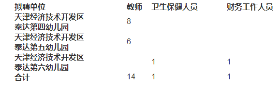 2025年天津市滨海新区泰达公办幼儿园公开招聘,本次共招聘教职工16人,其中教师14人,卫生保健人员1人,财务工作人员1人。