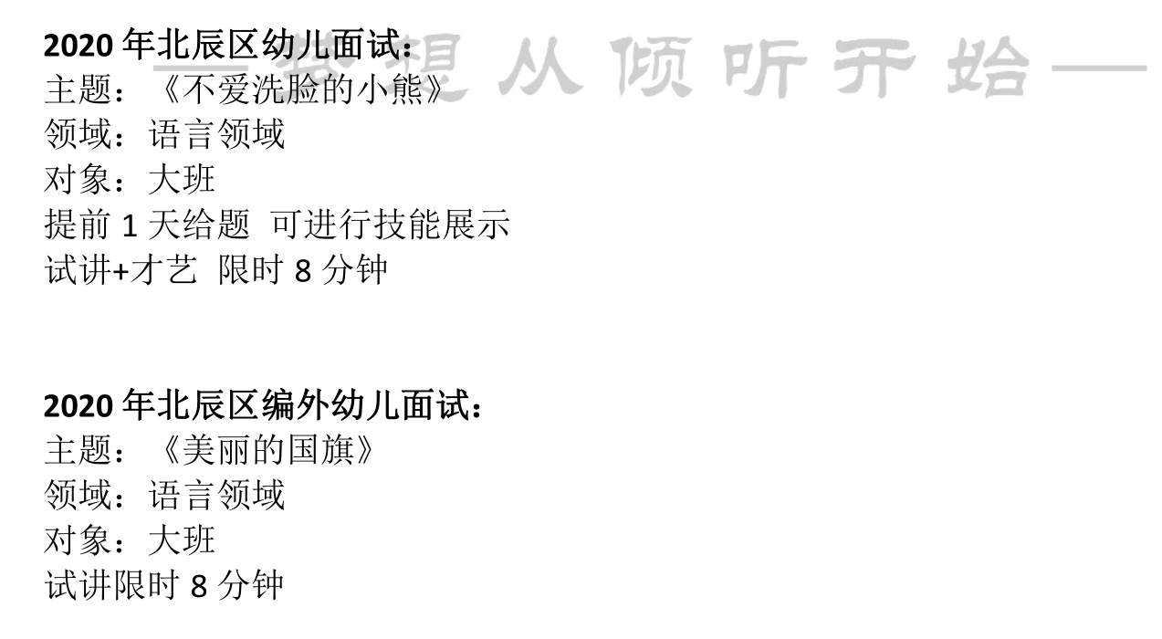 这是北辰区历年面试形式,相对比较稳定,每年都会考试讲,有些年份会加上结构化,这次北辰二招幼儿的考试,只有幼儿学科,没有结构化,面试内容为:试讲+技能展示。