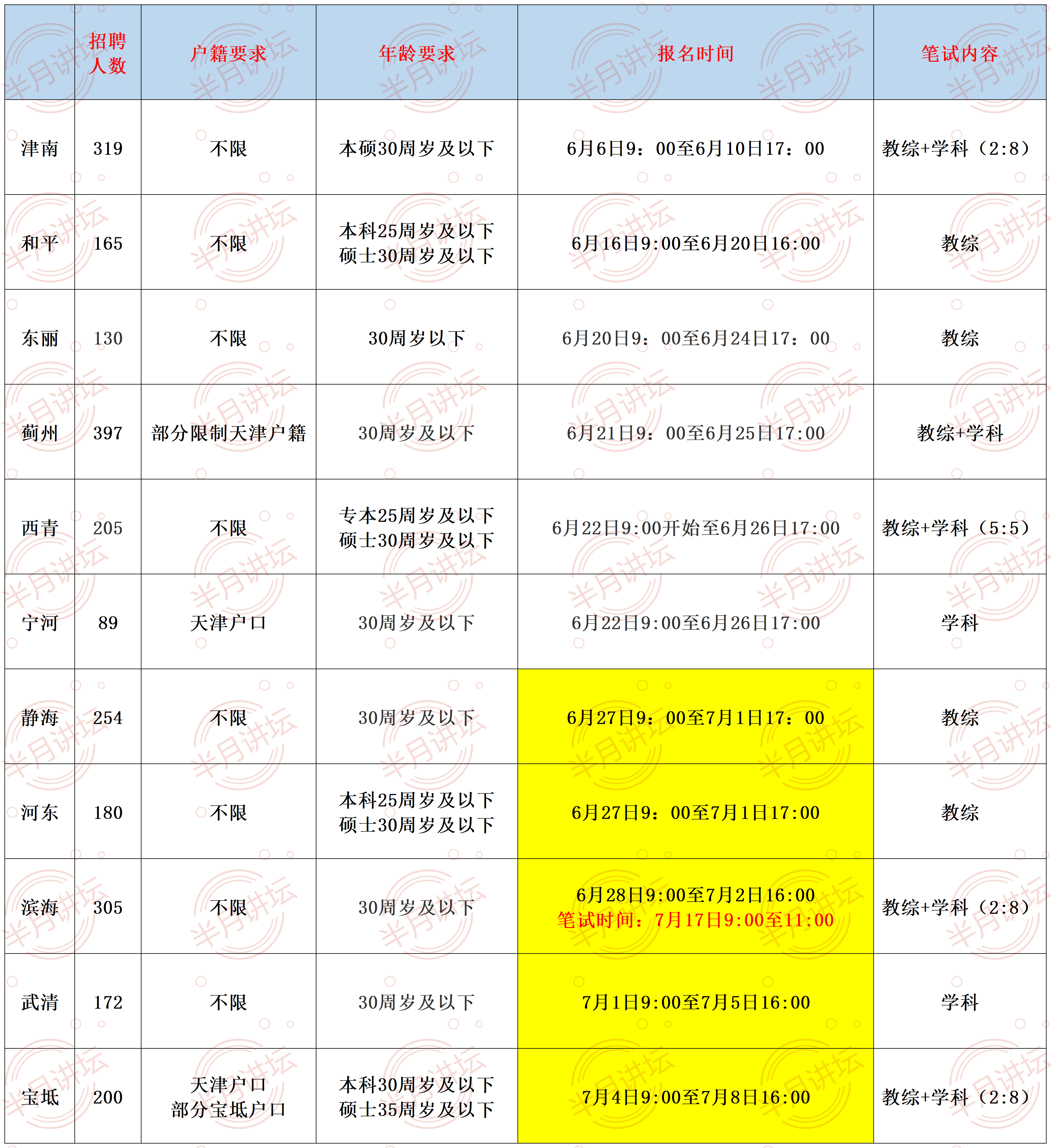 目前,只有滨海新区确定了笔试时间,其他区虽然没有公布笔试时间,但是建议同学们,只要符合条件,就都要报考,先不要考虑会不会时间冲突的问题。