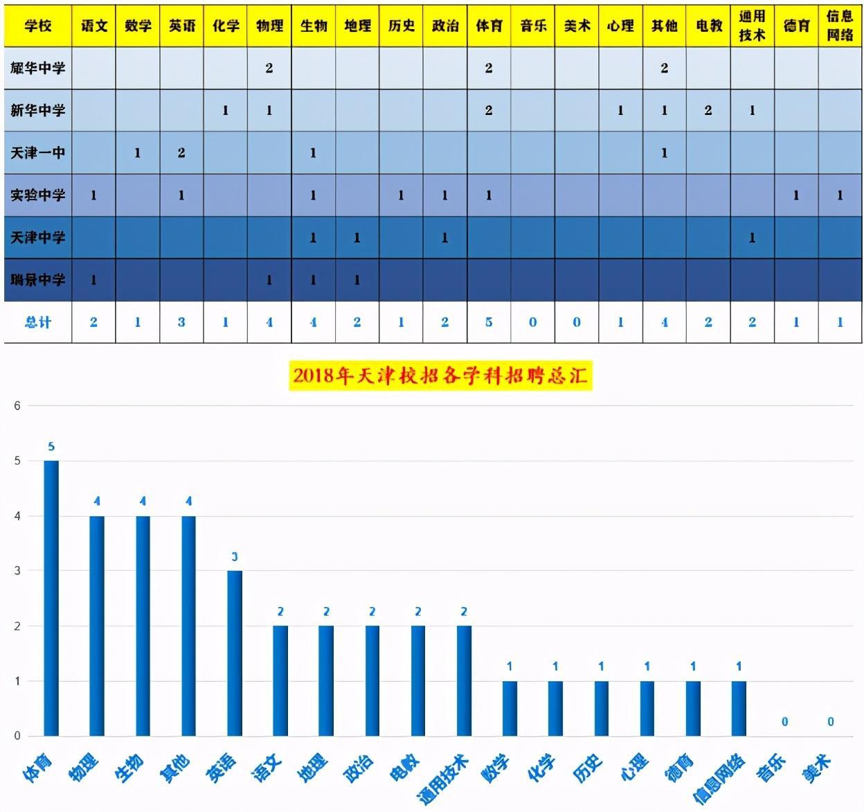 校招的学科招聘数量远不能和区招相比,毕竟是单独的学校,所以,有可能你各项招考条件都符合,也无对应学科可选,老师总结了近三年天津校招各学科招聘数量,供同学们参考。