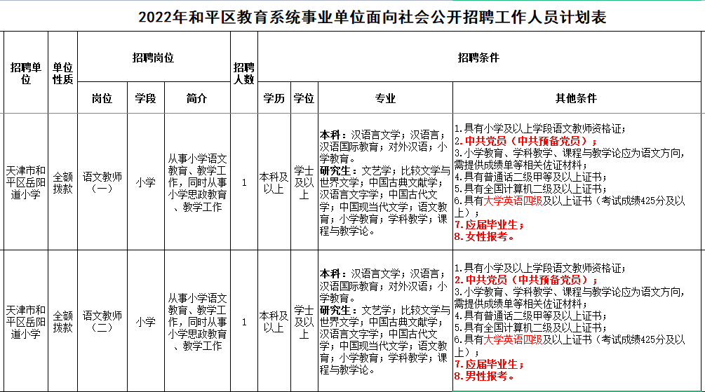 各区政治教师招聘要求党员,和平区有语文等学科也要求党员!这两年分岗较细,也分男生岗、女生岗。