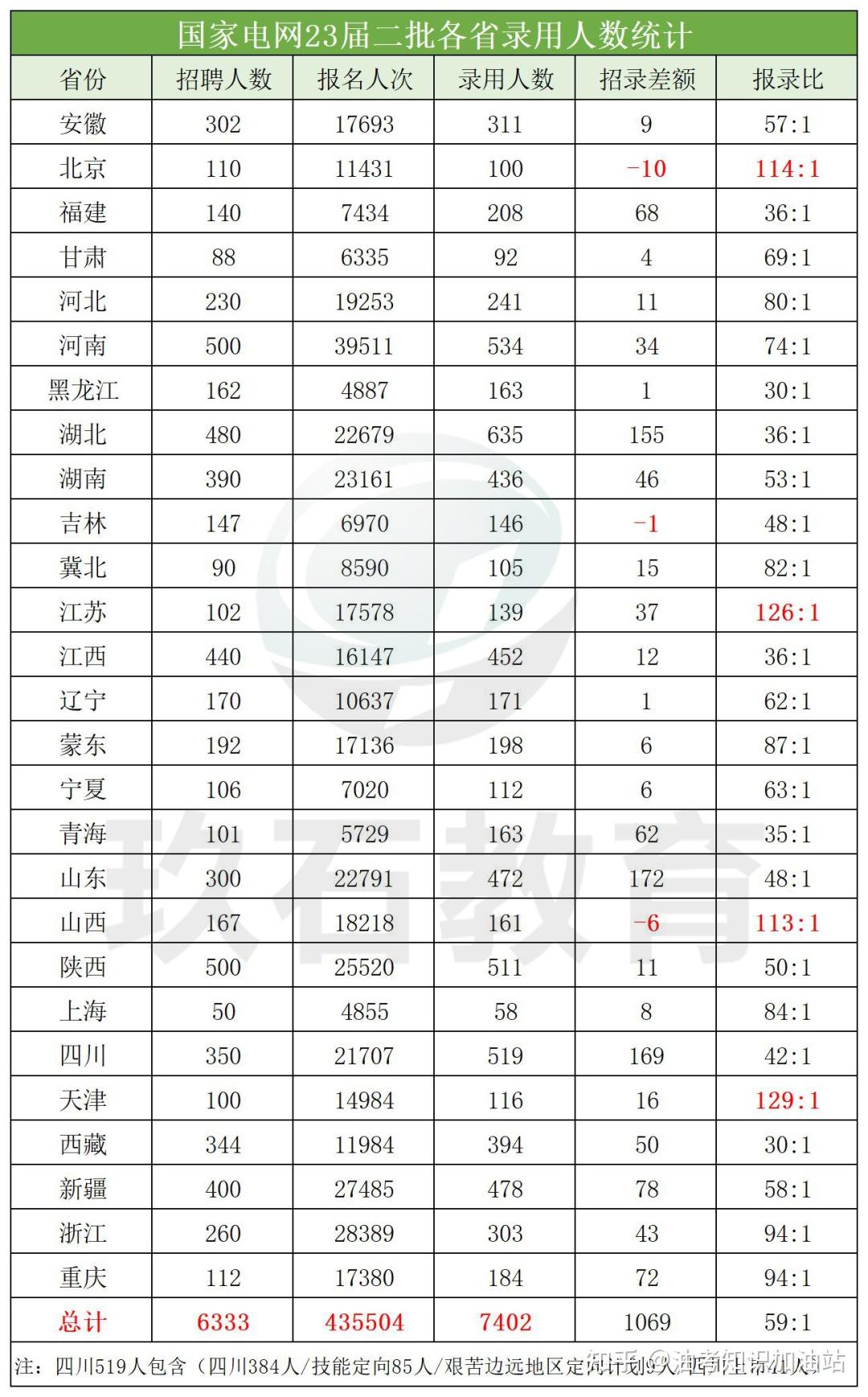 在23届一批次招聘中,报录比排名前列的有天津电力(48:1)、北京电力(38:1)、蒙东电力(40:1),天津省网竞争压力最大,北京次之,蒙东第三。报录比最低,也就是竞争压力最小的省公司有吉林(9:1)、辽宁(8:1)、重庆电力(12:1)。