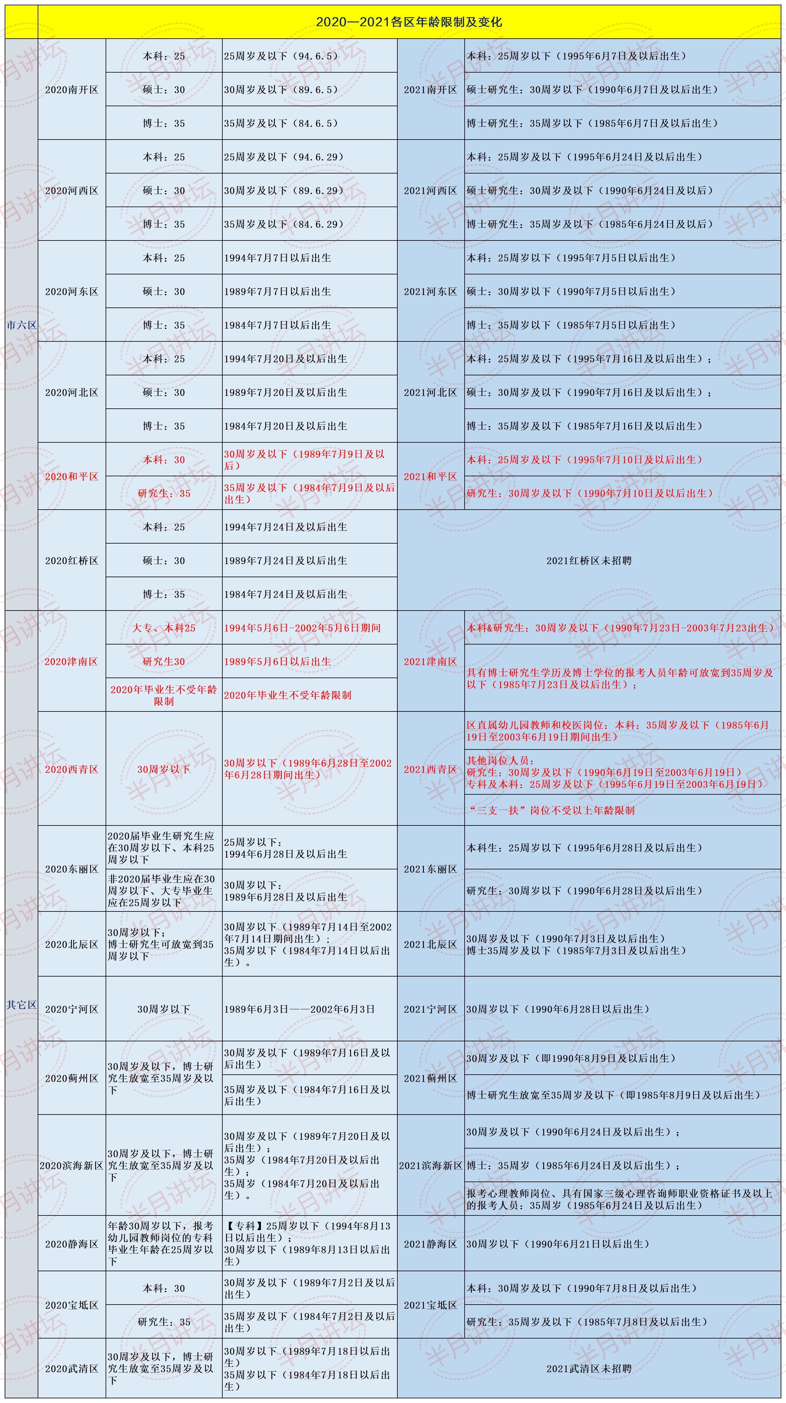 津南区和西青区在年龄上是有所放宽,津南区从去年本科25周岁变为本科30周岁,西青区在幼儿部分岗位招聘上把年龄放宽到了35周岁。