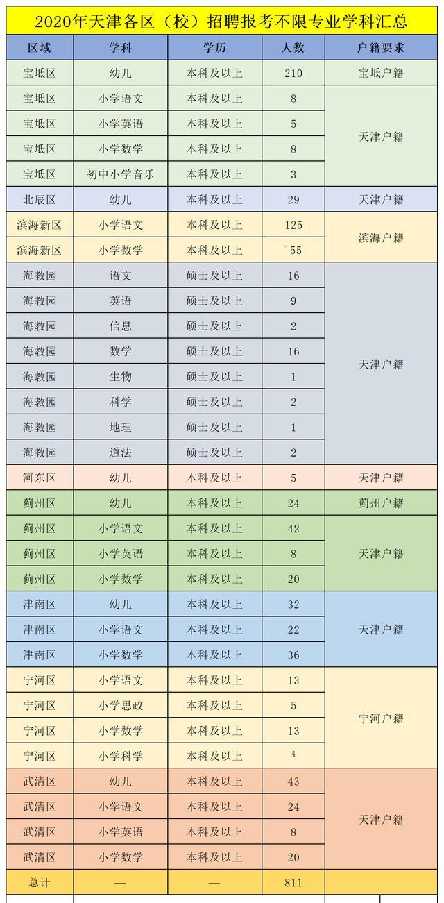2025年度天津教师招聘(在编)各区不限制专业人数811人!比2025年减少68人(2025和平招聘非正常情况)。