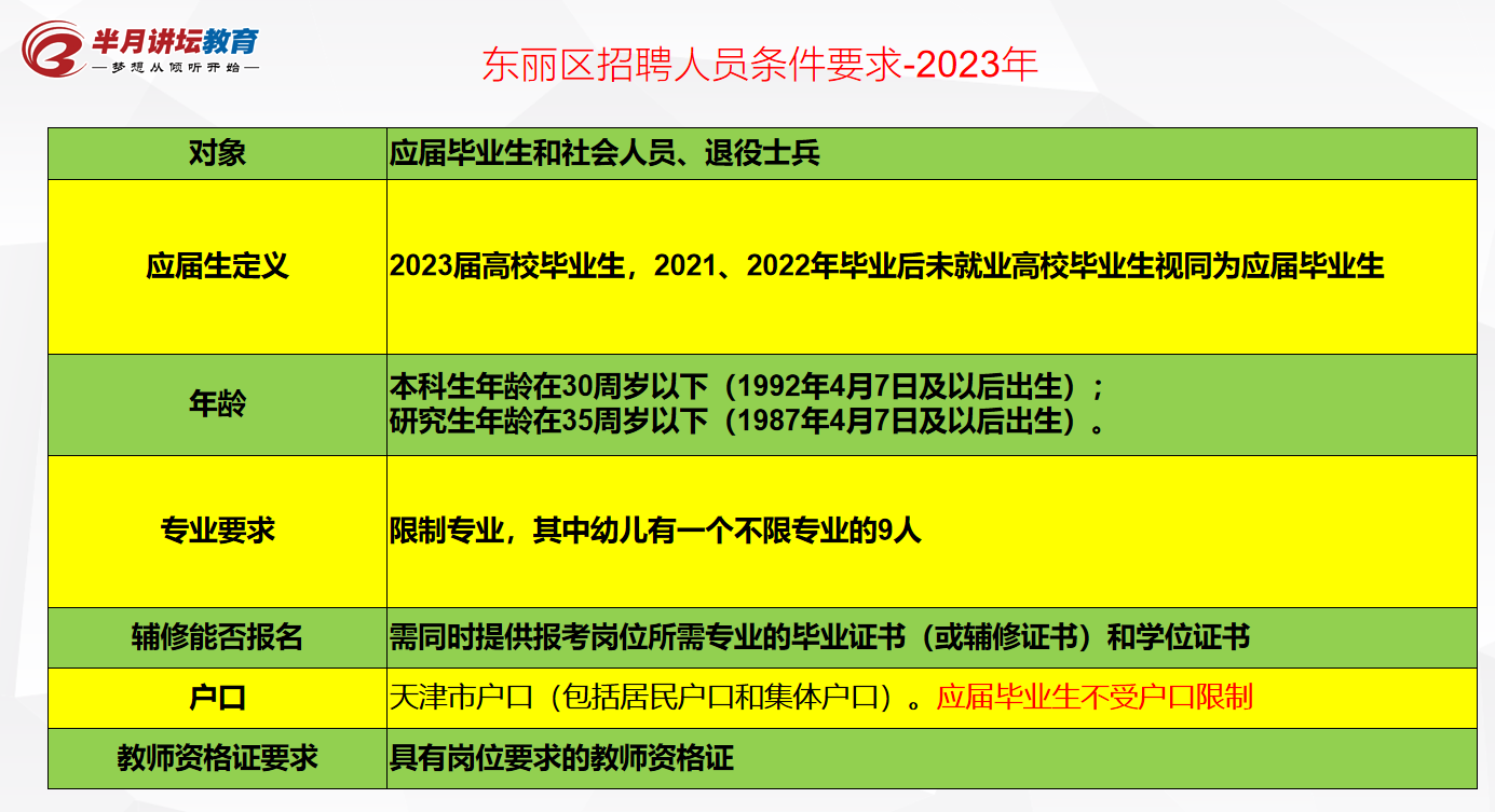 户口:去年是符合天津人才落户即可,天津户口其实很好迁进,全日制本科即可,备考教师编的同学,大部分都是全日制本科;今年限制了户口,阻碍了一大部分备考人,但应届生不限户籍,还是应届有优势,考编要趁早。