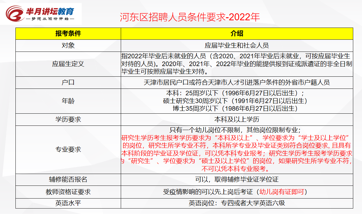 报考条件:河东区是市内六区唯一一个有不限专业岗位的,每年有几个不限专业的幼儿岗位,其它岗位都限制专业,本次二招没有幼儿教师岗,这次的岗位应该都是限制专业的!