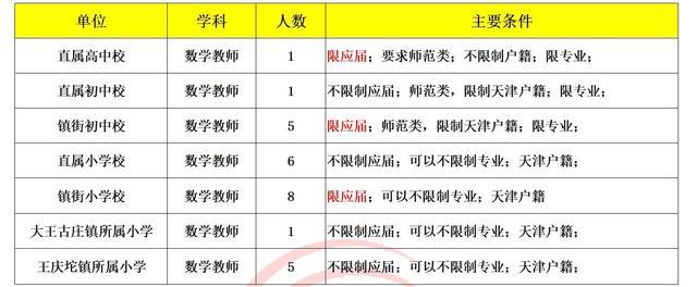 武清区数学岗今年共分为了7个,其中3个岗位限制应届生;4个岗位不限制应届; 中学岗位都限制师范类;只有高中岗位不限户籍;小学岗位都可以不限制专业。