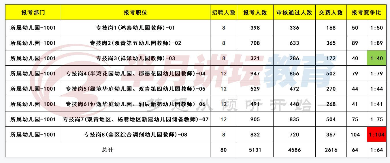 岗位8竞争最大,竞争比达到1:104。对比一下这几天的竞争比,大家都是一样的心理,看哪个岗位竞争比小,就报哪个岗位,随之,竞争小的岗位第二天竞争比就登顶,上午10点再报名的同学估计也不会再去报岗位8了,到最后竞争应该相差不会很多。