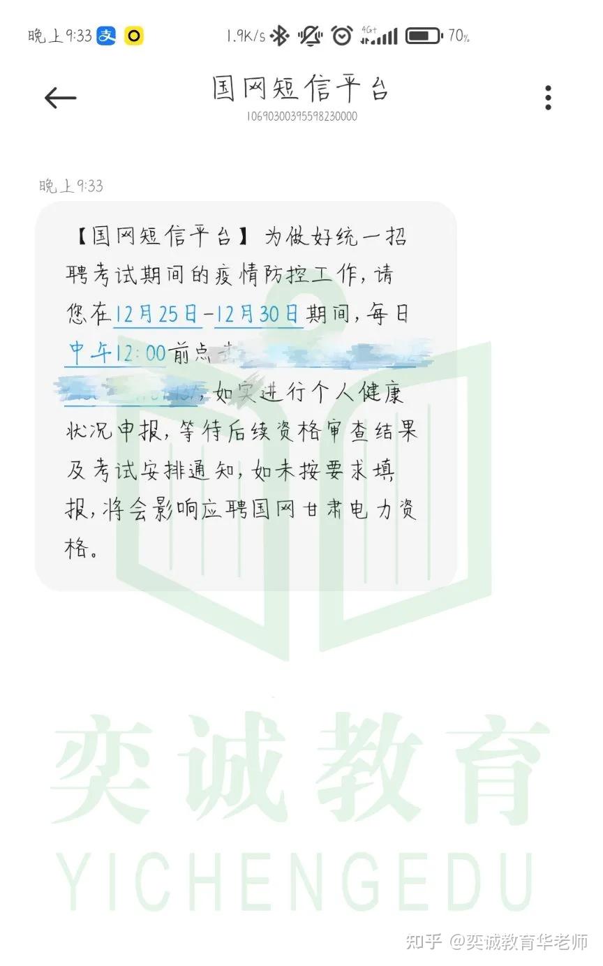 12月24日晚,甘肃的短信也发送到,是要求在12月25日-12月30日期间,每日进行个人健康状况申报,填报同样影响应聘资格,同学们还是记得定好闹钟,每天中午之前填好。